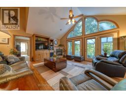 Welcome to 5 Whispering Pine Lane, a quiet and rarely available area, celebrated for its ravine lots and grand custom-built homes. This exceptional residence offers over 3,300 sq. ft. of total living space, blending timeless design with thoughtful details that set it apart. Inside, soaring vaulted ceilings and expansive windows frame the treescape beyond, offering views that change beautifully with the seasons. Picture the vibrant colours of fall, the fresh green canopy of spring, or the first snowfall, creating a serene winter backdrop all while a gas fireplace adds warmth and ambiance. The open-concept main living area connects the kitchen, dining, and living room, making it ideal for both relaxed, daily living or lively entertaining. The kitchen features newer appliances, built-in oven, garburator, and abundant oak cabinetry, while the living room is enhanced with a built-in surround sound system for an immersive experience. A versatile front office or bedroom, convenient laundry, powder room, and a private primary suite with 4-piece ensuite complete the main floor. Upstairs, two generously sized bedrooms share a 4-piece bathroom, providing comfortable retreats for family or guests. The fully finished basement expands the living space with flexible recreation areas and a second gas fireplace perfect for cozy movie nights or game-day gatherings. Outdoor living is equally appealing. Enjoy morning coffee on the wide covered front porch or evening cocktails on the back deck, shaded by the awning and overlooking the beautifully landscaped grounds. Here, every season feels special. With a new furnace, central air, central vacuum, an in-ground sprinkler system, a spacious double-car garage, and all major systems owned outright, this home combines peace of mind with an exceptional lifestyle. An extraordinary opportunity to call 5 Whispering Pine Lane, home. (id:16244)